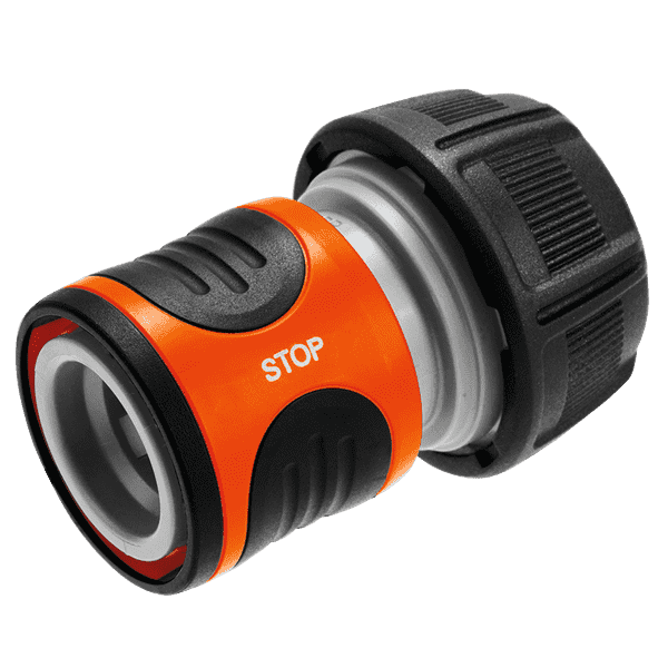Cuando se desconecta un dispositivo de conexión, por ejemplo, una boquilla o rociador, se detiene el agua de forma automática; cuando se conecta un dispositivo, el agua fluye libremente de nuevo. Esto ahorra un viaje a la llave cuando se cambia de accesorios.