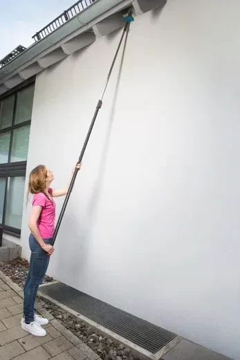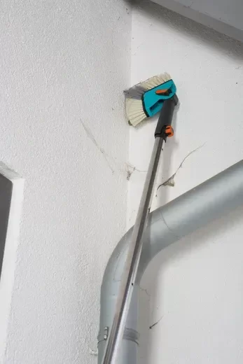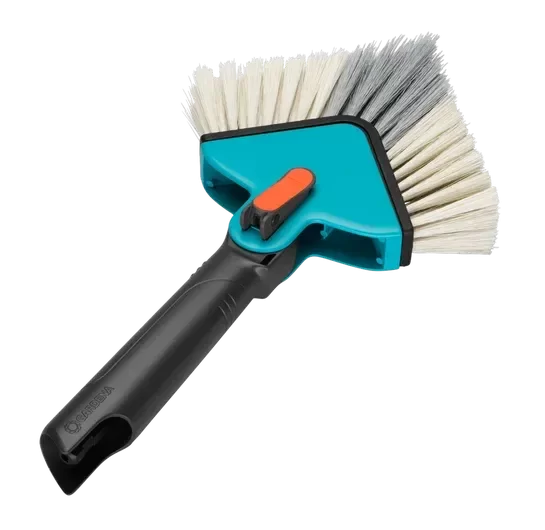 La escoba acodada de GARDENA combisystem está optimizada para quitar telarañas, por ejemplo, para llegar a las zonas más difíciles y esquinas.