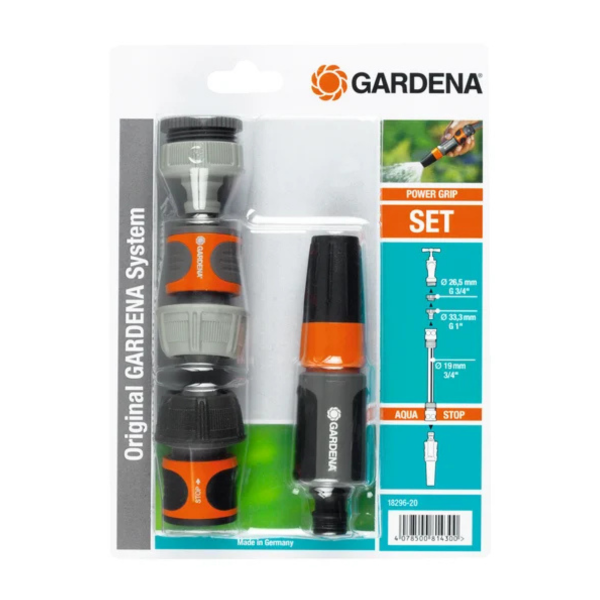 Incluye: Un reductor de 1" a 3/4" (1 x 0530520), un conector de canilla de 1" (1 x 1820220), un conector de manguera de 3/4" (1 x 1821620), un conector de manguera stop de 3/4" (1 x 1821420) y una lanza multichorro Classic (1 x 1830020).